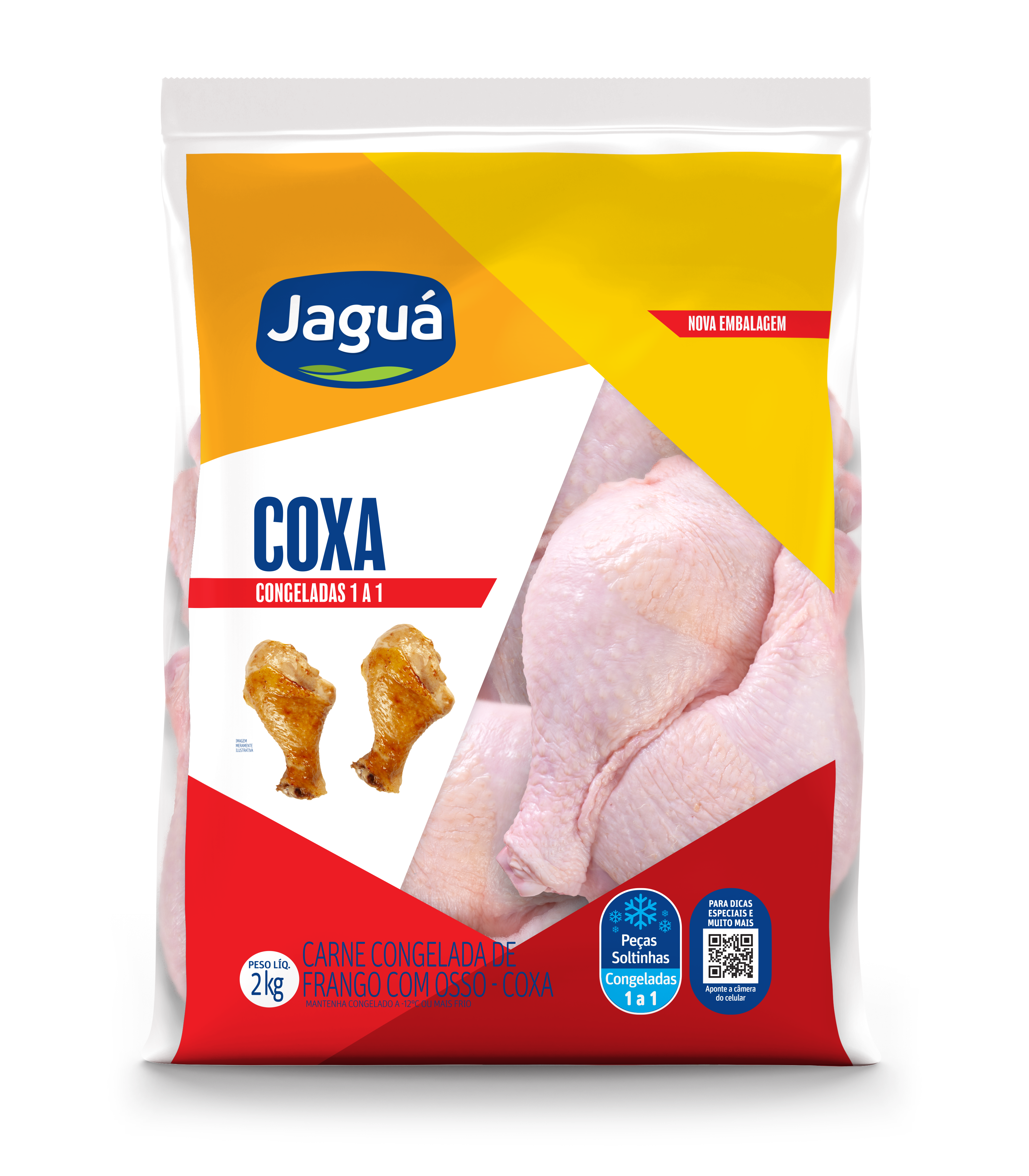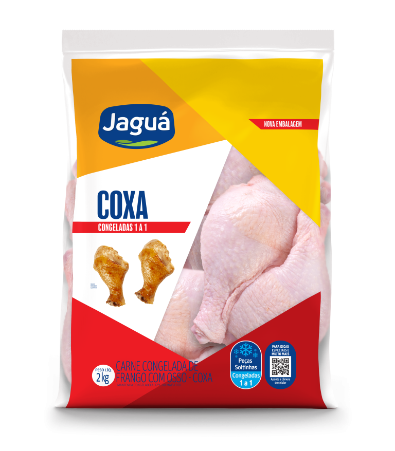 Coxa Jaguá realça gordura suculenta do osso único. Congelada, asse, grelhe ou cozinhe em molhos. Maciez profunda. Econômica para coxinha de galinha ou assados solos.