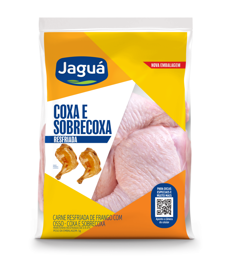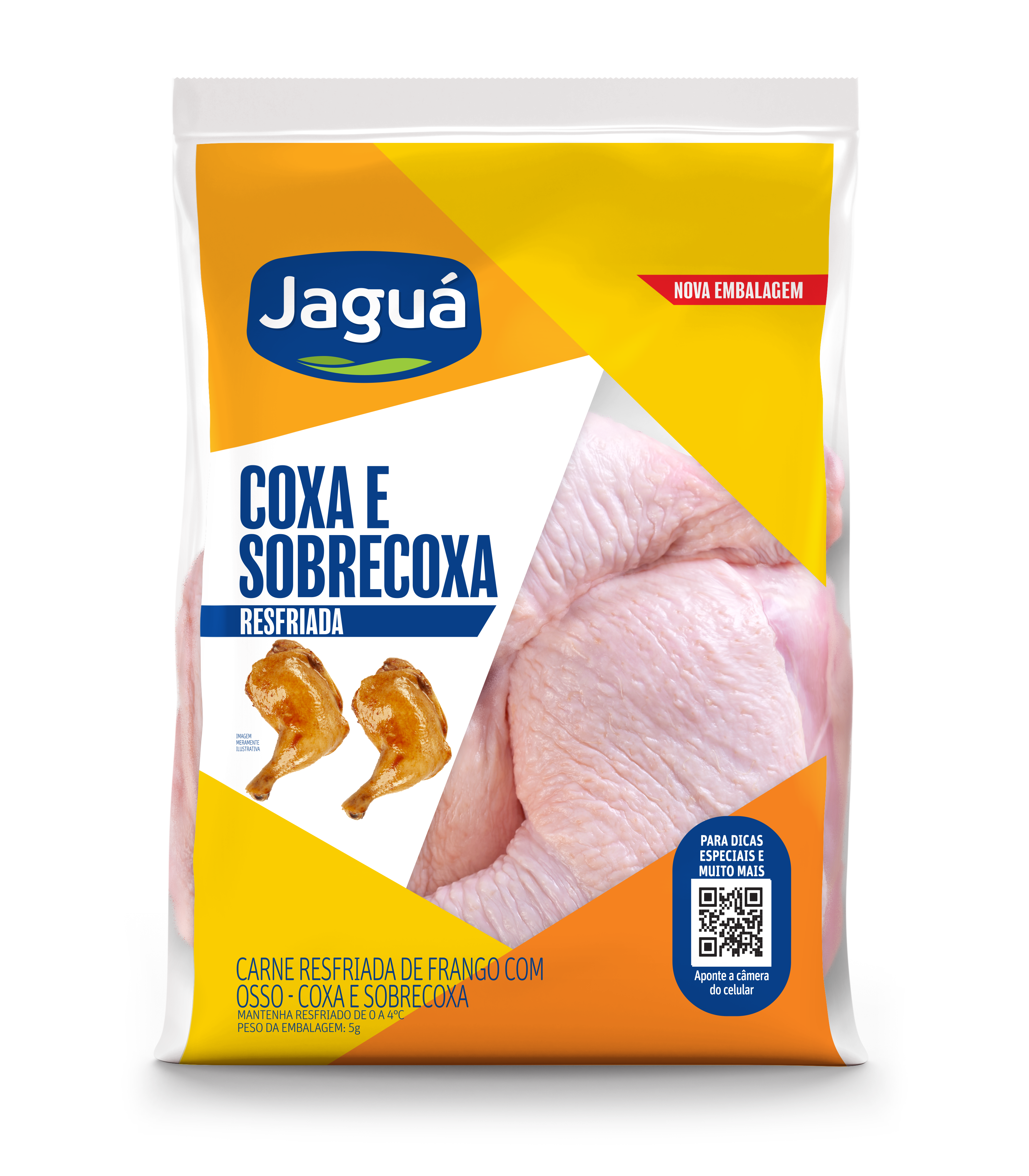 Coxa e Sobrecoxa Resfriada Jaguá combinam gordura natural do osso para sabor profundo. Fresca, asse, grelhe ou desosse após cozimento. Suculencia extrema. Para assados com arroz, churrasco ou desfiado em tortas – frescor garantido.