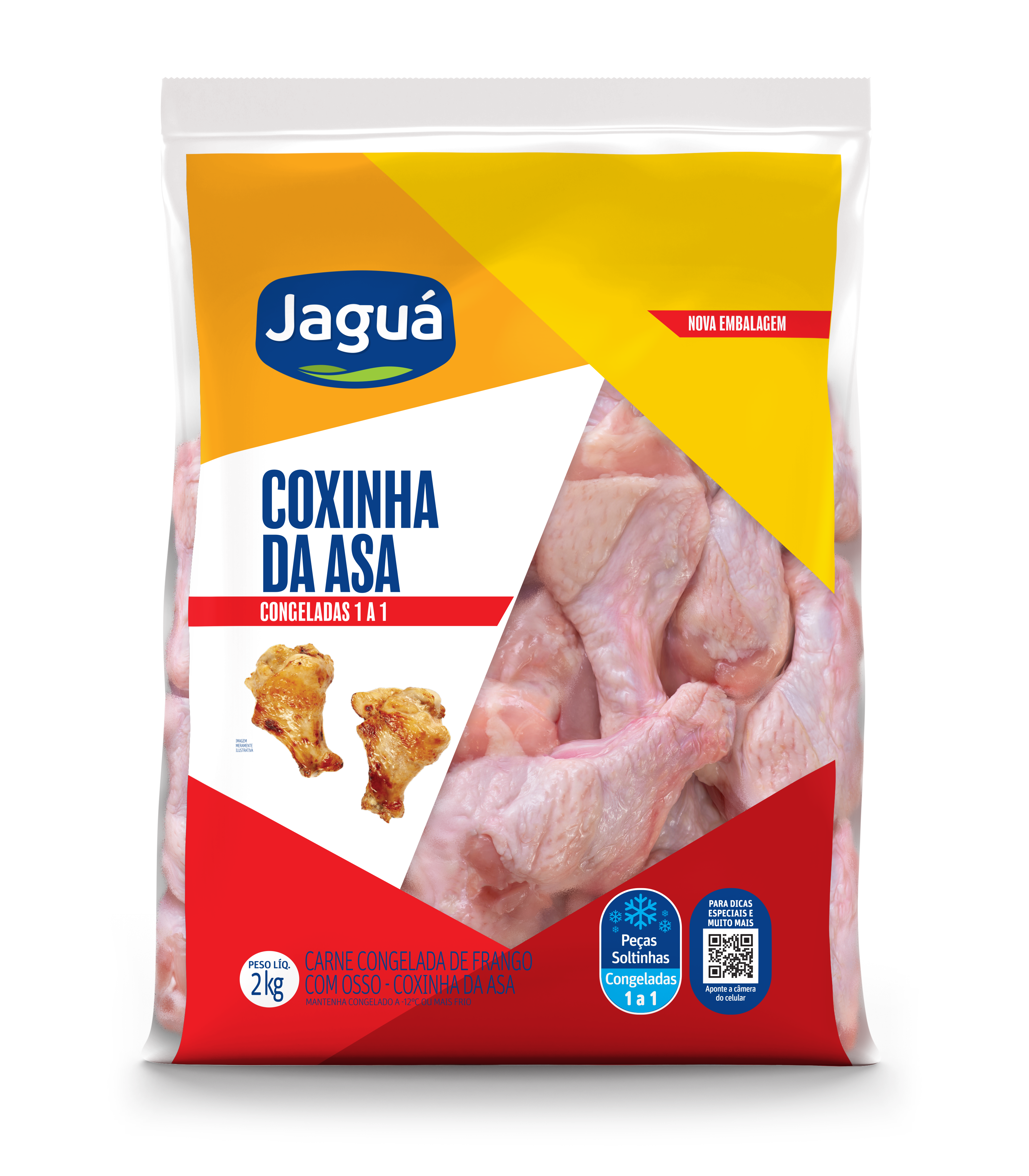A Coxinha da Asa Jaguá é congelada, com cortes selecionados para praticidade do dia a dia. Tempere e prepare na air fryer, forno ou grelha: macia por dentro e crocante por fora. Boa para petiscos, churrascos ou almoços rápidos da família.