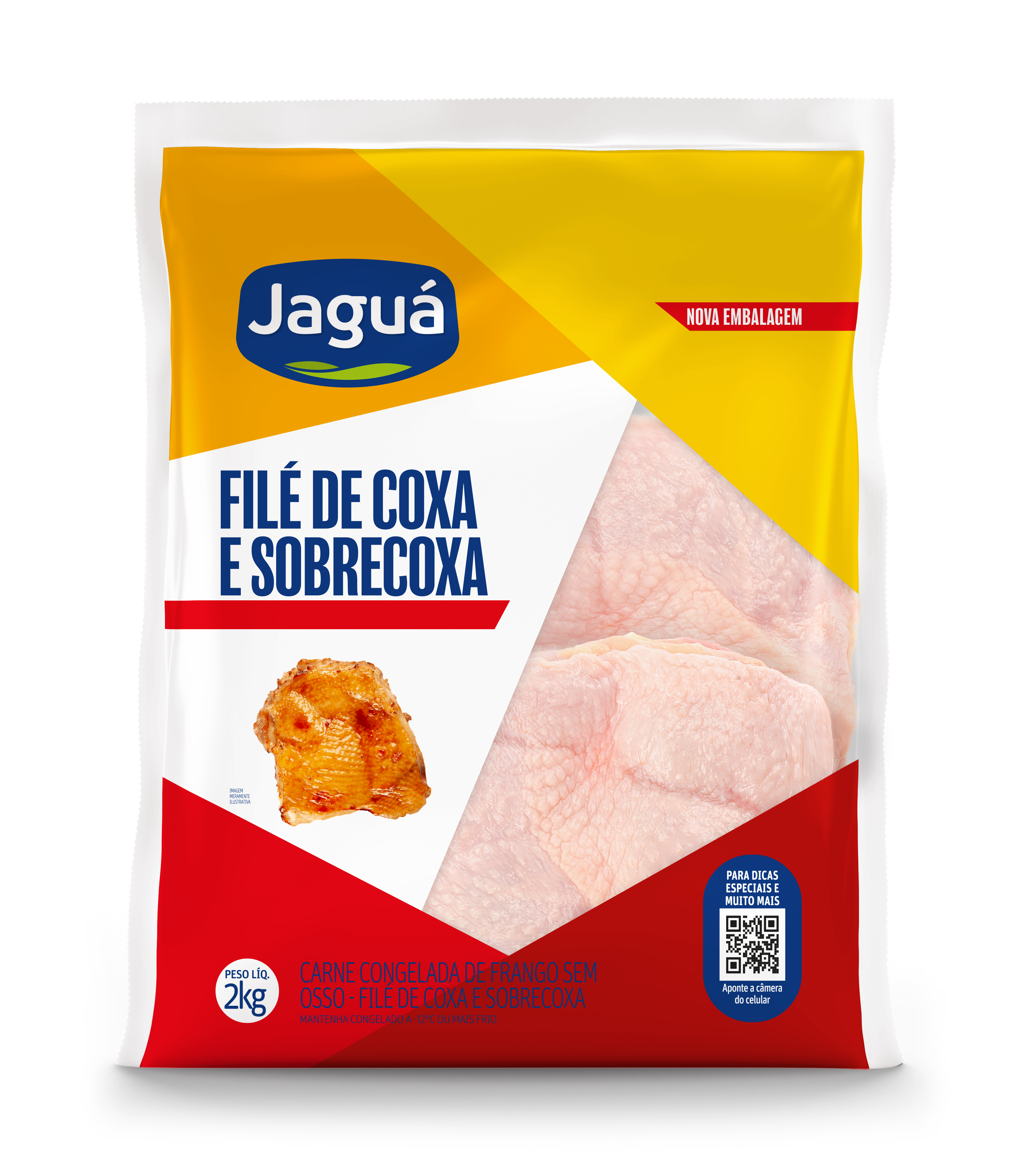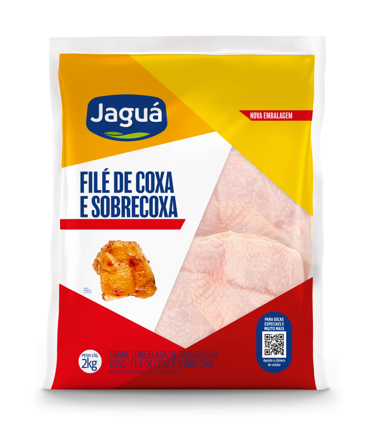 Filé desossado de Coxa/Sobrecoxa Jaguá mantém suco sem osso. Congelado, grelhe ou refogue. Perfeito para strogonoff ou salteados rápidos.