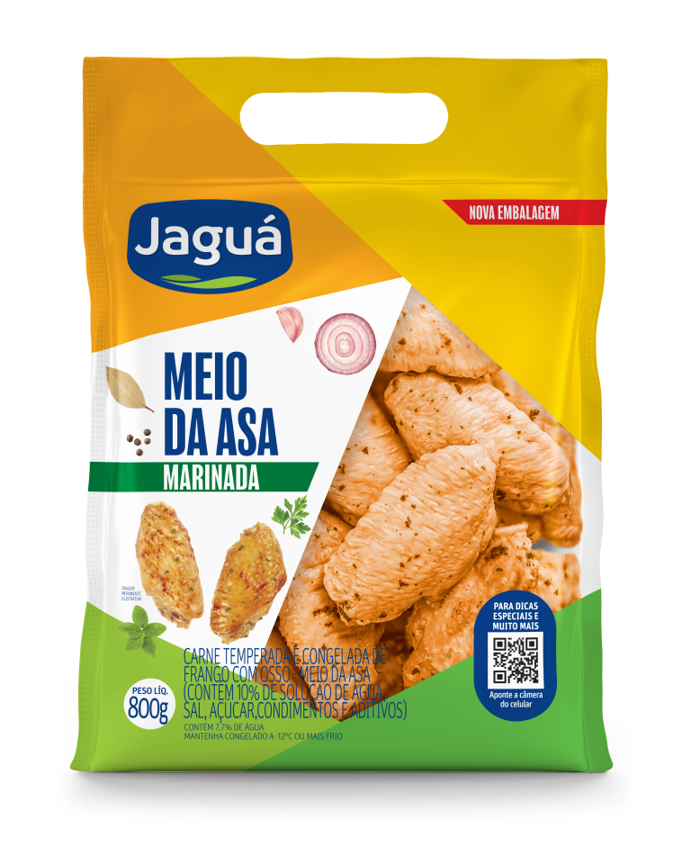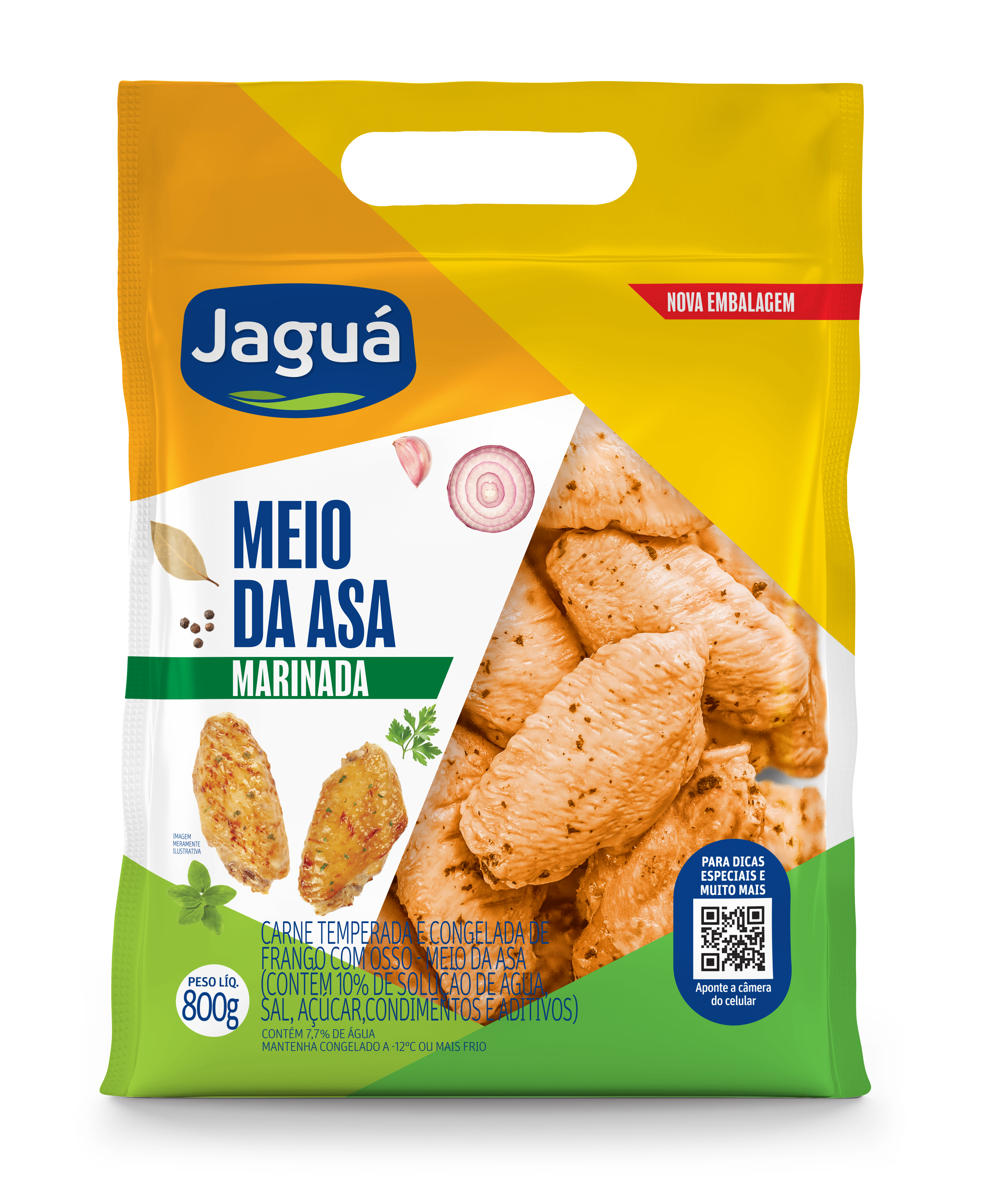 Meio da Asa Marinada Jaguá brilha pela marinada pronta que realça o sabor concentrado na tulipa. Congelada, prepare em air fryer (20 min/200°C), forno, churrasqueira ou frigideira. Suculenta por dentro, crocante por fora. Para churrascos, petiscos ou saladas quentes.