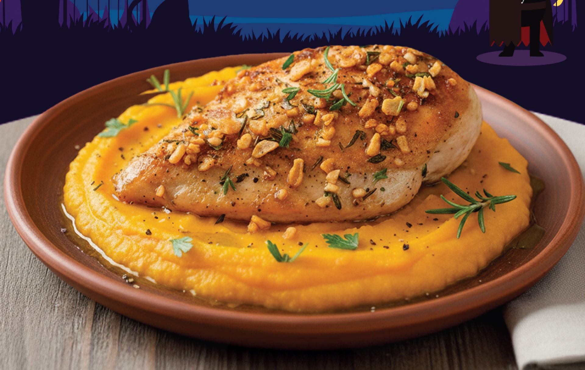 Filé de Peito com alho dourado e ervas, com purê de abóbora