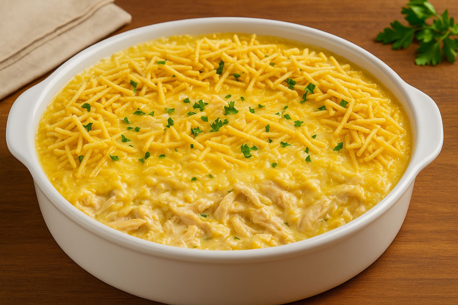 Coloque o refogado numa assadeira, cubra com muçarela e espalhe a batata palha por cima.